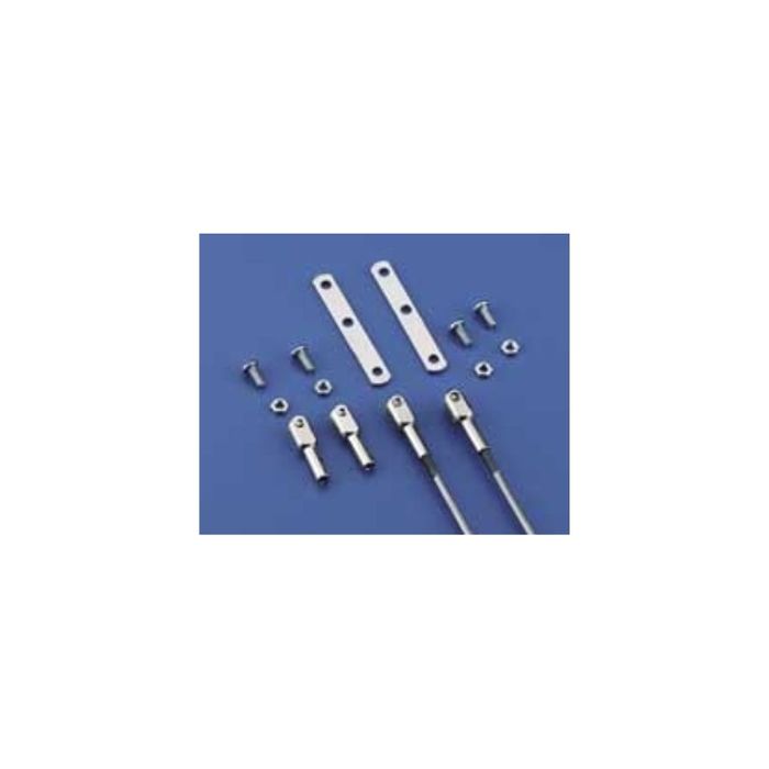 Perfect for many 1/4 scale applications, including strut attachments, flying wires, tailfin stab bracing, and bi-plane aileron connectors. Heavy duty steel and nickel plated. Includes 2 ea Threaded Rods Ends, 2 ea. solder rod ends, 4 ea #202 Steel Straps, 2 ea 12" long .093" diameter rod with 3/4" 4-40 Thread, 4 each 4-40 x 1/4" screws, and 4 each 4-40 nuts. (QTY/PKG: 2 assemblies ). Weight: 41 grams/assembly.