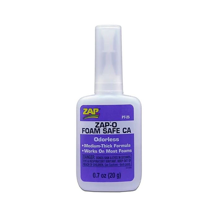SENSITIVITY: ZAP-O FOAM SAFE CA+ Is a true odorless CA that really does work. If you are one of the unfortunate ones that are sensitive to or have allergic type reactions to the odors given off when regular CA’s set, this is the glue for you. ZAP-O FOAM SAFE CA+ has the same gap filling properties as the regular ZAP-A-GAP CA+ but without the fumes. ZAP-O FOAM SAFE CA+ works great on balsa, plywood, bass wood and most other modeling and hobby materials. ZAP-O FOAM SAFE CA+ is also great for craft work when gluing foam shapes or various materials to foam products. If you are sensitive, the ZAP-O FOAM SAFE CA+ “No-more-tears” formula lets you work quickly without suffering.