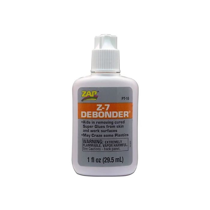 USES: Z-7 DEBONDER works to remove cured CA glues from skin, work surfaces, most plastics, and model finishes. Z-7 DEBONDER can also be used to remove adhesive left from stickers, pen and marker inks, some paints and stains, decals, correction fluids and finger nail polish. You can use Z-7 DEBONDER to weatherize and highlight your models and soften CA glue prior to sanding.