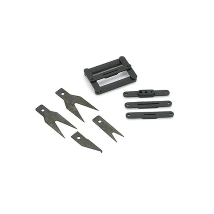 #216 - Centers & guides for perfectly aligned slots for any hinge. (3) blades fit #2 X-Acto handle. (3) snap-on jig guides and (1) balsa picker. 1 per package. Handles not included.