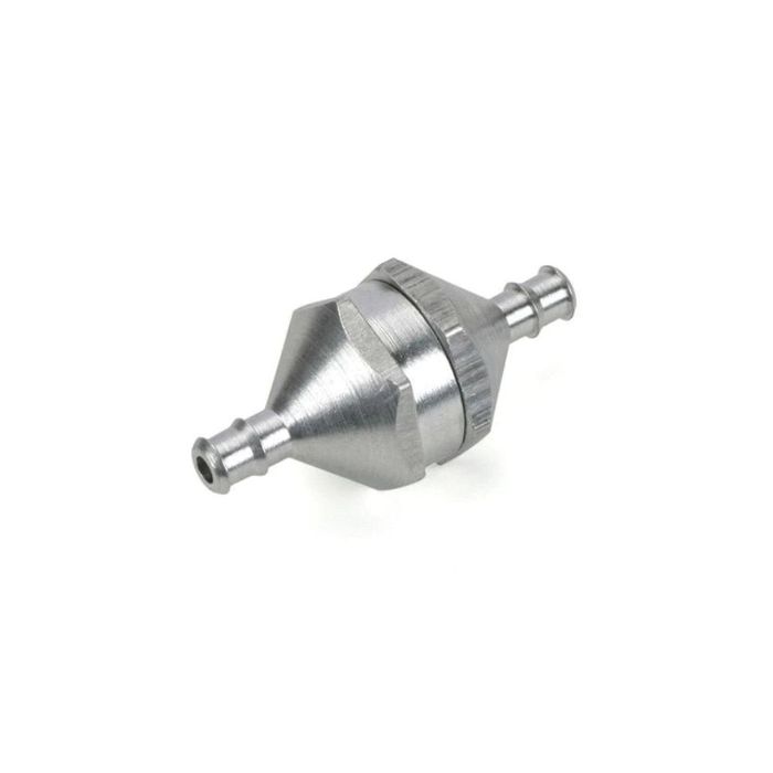 Constructed of two threaded aluminum parts which separate for ease in cleaning. Works for both gas and glo fuels. 130 micron mesh screen filter to filter out the smallest of particles and an o-ring for a positive, no-leak seal. Dimensions: 1.125" (28.575 mm) L X 7/16" (11.11 mm) W.