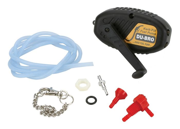 Works with gas and glo fuel. Comes complete with silicone fuel tubing (for gasoline, purchase Tygon tubing, see #506), Kwik-Fill Fuel Cap Fitting, mounting chain, and pick up. Pump transfers 1 oz. per 3 revolutions. 1/pkg