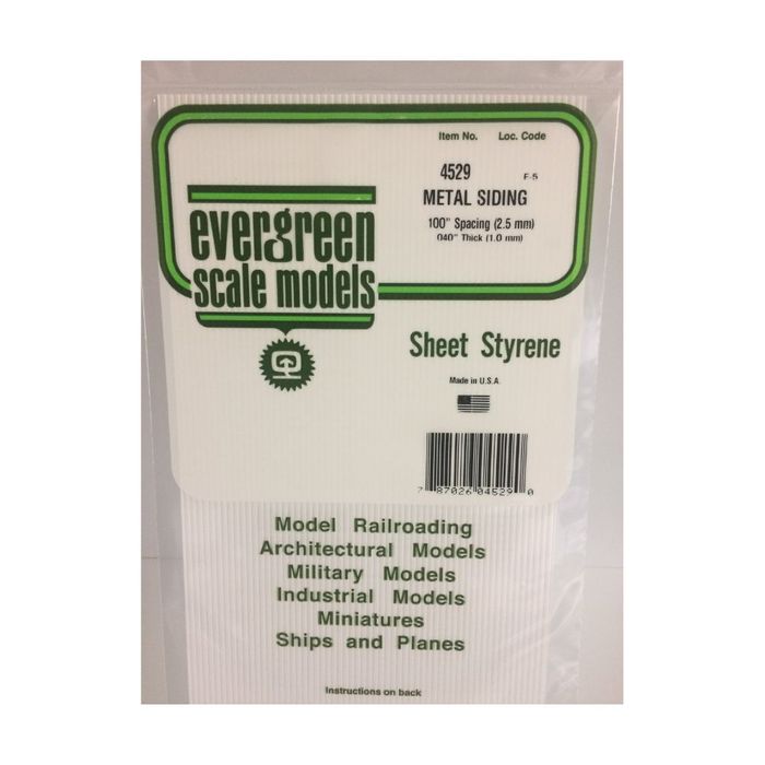 FEATURES: White styrene sheet is 12" x 6". The sheet has grooves with .100" spacing that resemble metal siding. Sheet may be cut and shaped to fit modeling needs - small scale to larger scale. Sturdy and durable. Used for train scratch building or general scratch model building. User friendly, economical, and high quality styrene enhances scratch model building techniques. May be painted and weathered.