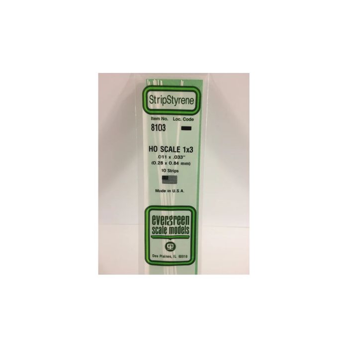Contains Ten .011" X .033" OPAQUE WHITE POLYSTYRENE HO SCALE STRIPS (1X3)