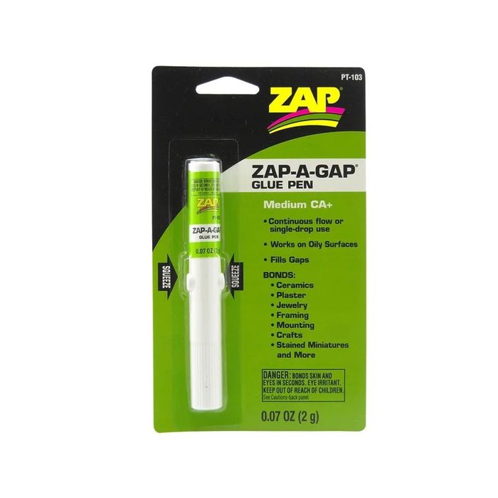 ZAP-A-GAP CA+ Is the best selling instant glue in the world. The ability to bond virtually anything to anything with consistency unequalled by any other brand makes it the favorite adhesive across many varied disciplines. Widely used throughout the hobby industry, it is the absolute best and most consistent performing glue for model building and crafting. Some uses besides hobbies and crafts include; jewelry manufacturing and repair, taxidermy, pool cue tips, darts, archery, knife making, mold and pattern making, furniture refinishing and antique repair, auto detailing, dental molds and patterns, ceramic repair, and for fishing, fly line splicing and fly tying. For manufacturing, ZAP-A-GAP CA+ will bond metal and / / or plastic materials allows for fast simple positioning of parts for assembly or machining. Wood turners and manufacturers of custom wood products appreciate the ability of ZAP-A-GAP CA+ to help "save" their projects by filling in and bonding cracks that often occur in expensive hard woods. Wood, plastic, metal, glass, ceramic, fabric, rubber, fiberglass, carbon fiber, or any combination of, ZAP-A-GAP CA+ can help solve many tough bonding problems.
