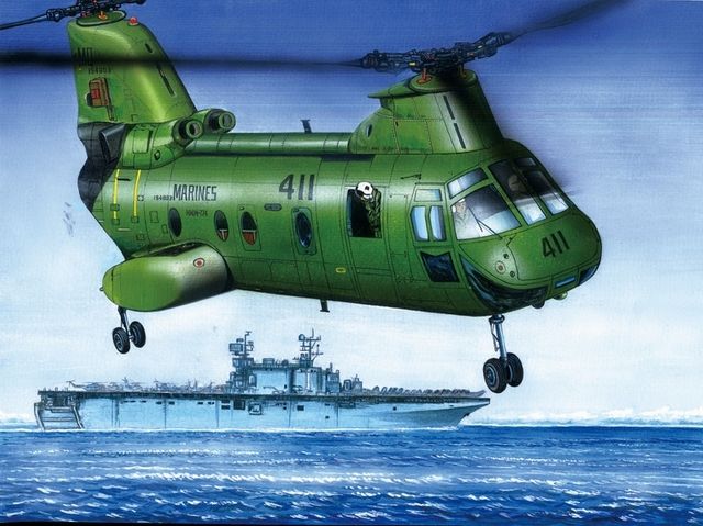 The Boeing CH-46 Sea Knight helicopter has served the US Navy and Marine Corps faithfully since the early 1960s. This venerable aircraft's primary mission areas in the Navy (as the H-46D) include Combat Logistics Support and Vertical Replenishment (VERTREP), Search and Rescue, and Special Operations. As a Marine Corps platform? The CH-46 Sea Knight helicopter is one of the largest helicopters in the US Navy inventory. The Sea Knight is a twin-turbine powered, dual-piloted, tandem rotor helicopter. First flight in August 1962 and first procured in 1964.The unique tandem-rotor design of the Sea Knight permits increased agility and superior handling qualities in strong relative winds from all directions, allowing, in particular, rapid direction changes during low airspeed maneuvering. This capability has resulted in the safe, efficient and graceful transfer of many millions of tons of cargo and many thousands of passengers over the years.