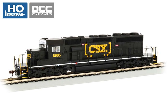 EMD SD40-2 Diesel Locomotive - CSX® BLACK (HTM™) - HO Scale. The SD40-2 was one of EMD's best-selling locomotives, with nearly 4,000 units delivered to more than 30 railroads between 1972 and 1989. Today, the vast majority remain in operation, many with their original owners (or their successor railroads), and examples can be found both across North America, and on railroads as far afield as Panama, Brazil, North Africa, and Australia. Designed for a wide variety of mainline and industrial roles, they are powered by a 3,000HP 16-cylinder EMD 16-645-E3 Prime mover. One distinctive spotting feature, when compared against other similar EMD locomotives, is their longer than average end platforms. This Bachmann SD40-2 features realistic, prototypical detail, and comes ready for operation with a factory-installed DCC decoder.