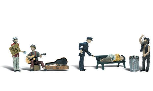 Set includes a policeman preparing to wake a bum as he sleeps on a park bench. A bum searches through the trash, one bum displays a "need money for food" sign and another strums his guitar.