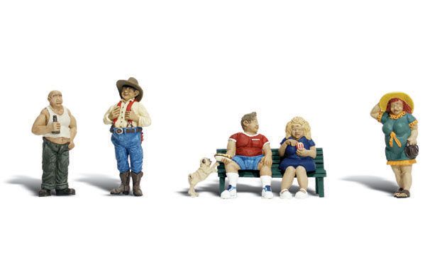 A man and a woman sit on a park bench. The woman holds her popcorn, while the man is totally unaware that a pudgy pug dog is trying to steal his hot dog. A man clutches his bottle to his belly. Another man observes, with his hands on his suspenders and a woman holds her hat and purse.