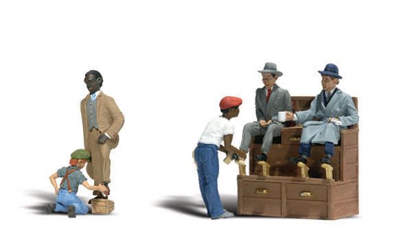 A set of five figures plus a small and large shoe shine box. One man is getting a shine, while another waits. The shoe shiner engages his customers in conversation, while nearby a small boy shines another man's shoes.
