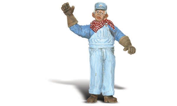 Ernie is on the job, dressed in his overalls and work gloves. He waves to his crew down the track.