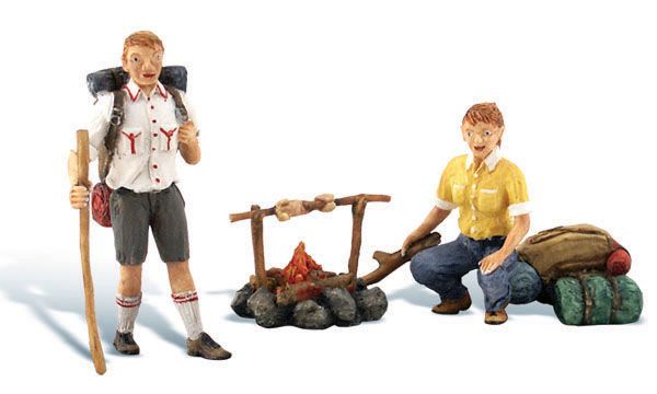 A young woman with tent and sleeping bag by her side cooks over a toasty campfire while her man gets ready for a hike.