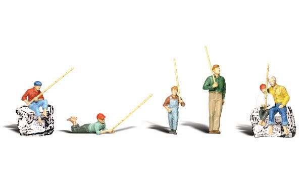 A set of boys and men, enjoy a day of fishing. Includes five can poles.