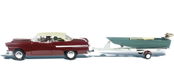 Lake-goers are loaded up and ready to go with their boat and vintage outboard motor in tow.