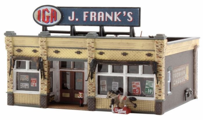 J. Frank's Grocery is modeled after the independently owned grocery stores that began sprouting up in the early 1900s. Many of those old stores can still be seen today in cities and small towns throughout America. Details and accessories include loading dock and dolly, large display windows, awnings, a kiddie ride, and more. This building features window treatments and you can add lighting to accentuate the printed interior. See photos for footprint.