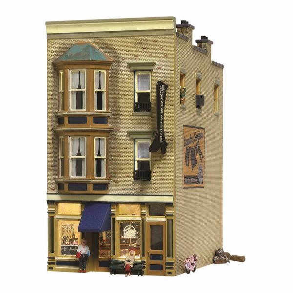 J.W. Cobbler models a downtown three-story storefront that houses the local shoemaker shop. A doorbell jingles and the rugged smell of leather greets your nose as you walk through the shop door. You can just imagine the village shoemaker sitting hunched over his cluttered workbench topstitching some new boots or re-soling a pair of shoes. This hand-painted and weathered building includes an installed LED interior light and a printed interior. See photos for footprint.