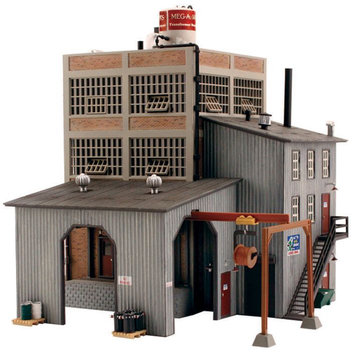 Set as the centerpiece of your layout's industrial park or alongside a spur. Authentic design and details include a track side loading dock, a printed interior, a naturally weathered exterior, full roof detail, rooftop water tower, crated transformers, movable overhead wire spooling assembly, vintage signage and more! See photos for footprint.