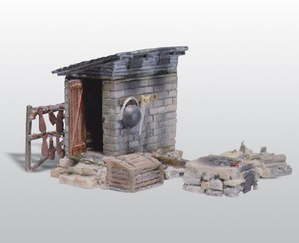 You can add this smokehouse anywhere on your layout. It includes smoked hams hanging on a fence, an old saw and bucket, plus stone and lumber piles.