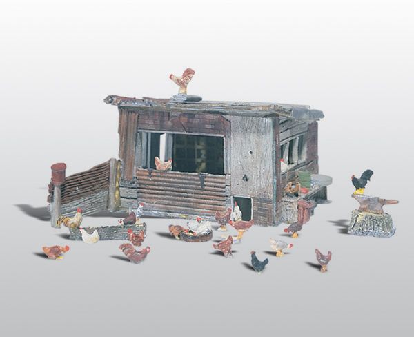You’ll practically hear the chickens clucking. This scene would be great on a country scene. Includes chickens, the shed, a bench, feeders and the old chopping anvil.