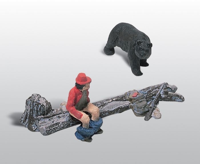Here's a whimsical look at an unfortunate woodsman. Pants around his ankles, gun out of reach and a bear shows up.