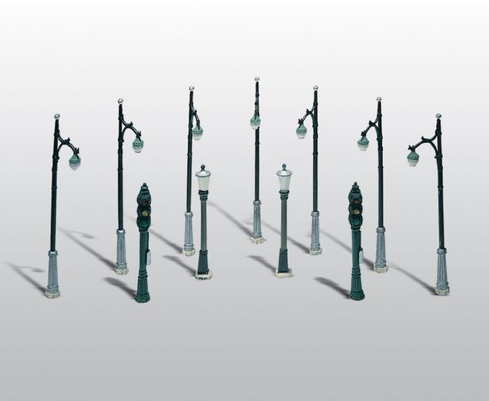 Sand, paint and weather these eleven lights of different styles to help set your scenes on various areas of your layout.