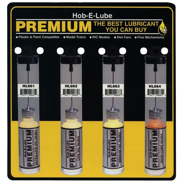 Hob-E-Lube is a complete, special-purpose line of lubricants designed for close tolerance model requirements. All Hob-E-Lube lubricants have been performance tested for use with trains, R/C cars, planes and boats and general household use. They are plastic and paint compatible.