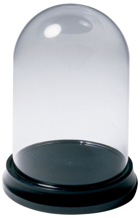 Glass Dome is 3" diameter x 4 1/4" high (7.62 cm x 10.7 cm) and Plastic Base is 1/2" (1.27 cm ) high.