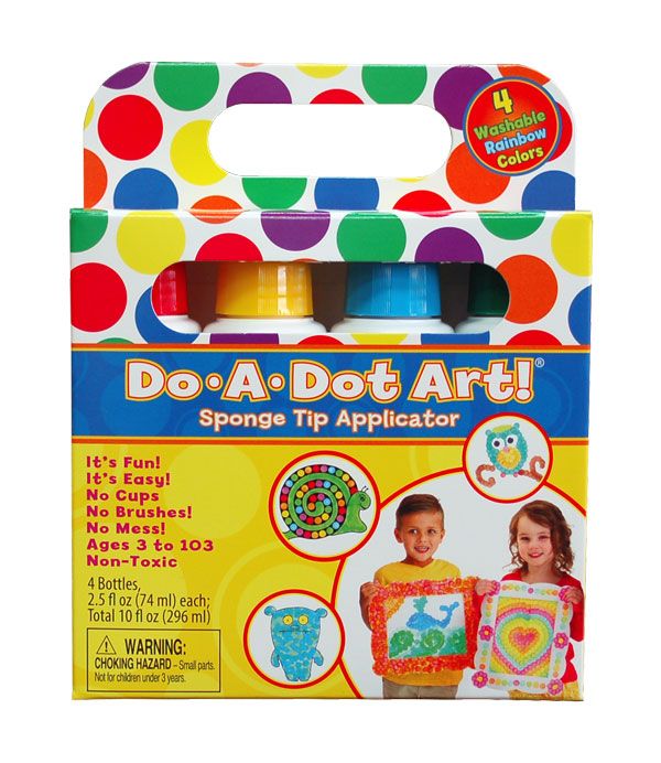 Do A Dot Art! This set comes with 4 washable dot markers in no spill, no splash bottles, which is a dream come true for parents and teachers. Do A Dot Art! is incredible for developing hand eye coordination and colour recognition for young children, and is the first art medium every young child should use. Let your imagination run wild with this set of primary rainbow colors.