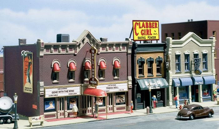 Give your layout town residents somewhere to go on Saturday night with this downtown theater, adjacent bar and grill and jazz club. More than 60 details including, 3 complete buildings, searchlight, park benches, sign beer bottle, marquees, garbage cans, newsstand, billboard and lights, backdoor light, air conditioner, down spout drain, fire escape, dog, louvered wall vent, bricked in windows, Pepsi® billboards, fire hydrant, dry transfer decals and more. See photos for footprint.
