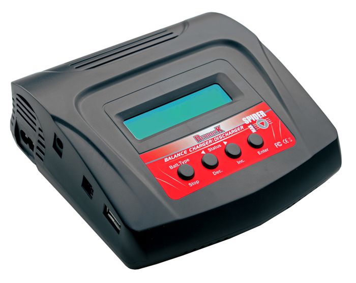 REDBACK RACING SPIDERMAX10. 80W, Microprocessor Controlled, High Performance, rapid Balanced Charger/Discharger suitable for LI-ION, LI-PO, LI-FE, LIHV( 1-8 cells ), NiCD, NiMH, ( 1-16 cells ), Pb, ( 2-28V ) Batteries. Input: AC 100 - 240V or DC 11.0 - 18.0V. Charge rate: 0.1 - 10Amps, Disch. Rate: 0.1 - 2.0Amps. Built in USB 5v/2.1A charging port., Servo Tester.
