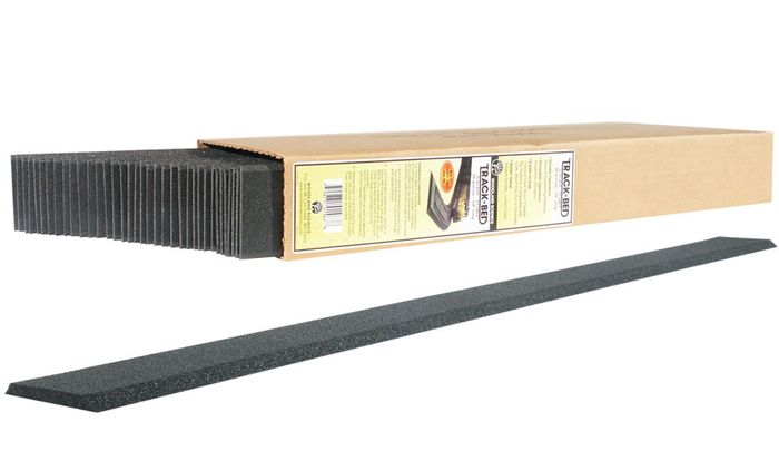 Strips are the perfect roadbed for tight track applications. They align well with cork or Homasote®*. Track-Bed deadens sound, requires no pre-soaking like cork, remains flexible and will not dry out or become brittle.
