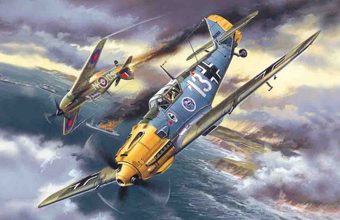 The modification Bf 109E has appeared in 1938. Bf 109E-3 became first mass-produced German fighters. They took part in Polish, Norwegian and French campaigns in 1939-1940. During Battle of Britain (August-October 1940) Bf 109E-4 fighters entered service. They main difference was the new canopy with armored windscreen. Bf 109E-7/Trop had special tropical equipment.