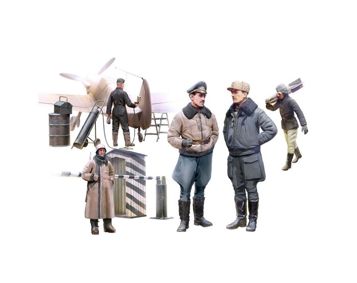 The set includes five figures of WWII German Luftwaffe pilots and ground personnel in winter uniform – two officers, two mechanics and sentry. This set also includes 50 kg bomb, spray gun, barrel, light ladder, sentry box, control barrier models.