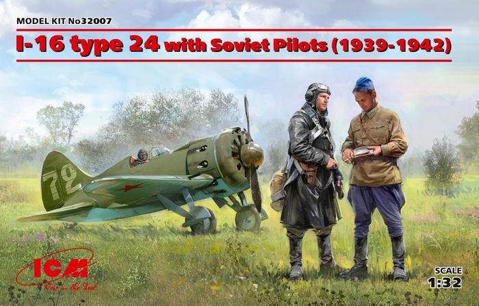 The set includes I-16 type 24 model kit and 3 figures of Soviet pilots (1939 – 1942 periods) .