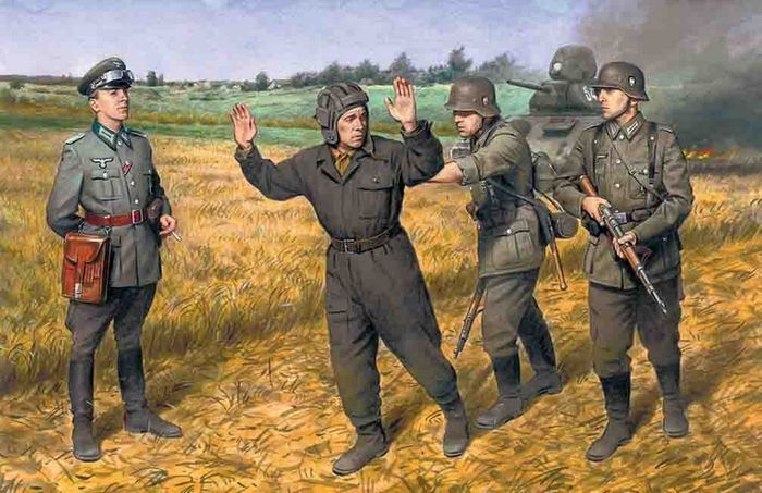 The kit includes four figures – one officer and two soldiers of early WWII German army, and also a figure of captured Soviet tanker.