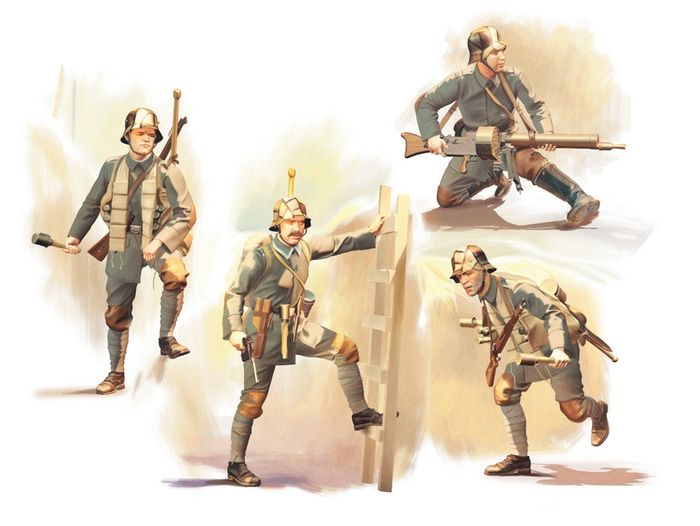 The set includes 38+146 parts for assembly 4 figures of German Sturmtruppen of 1918 period.