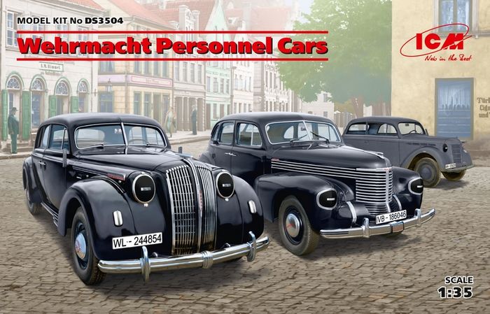 The set includes Kadett K38 Saloon, Kapitän Saloon, Admiral Saloon cars model kits in 1:35 scale.
