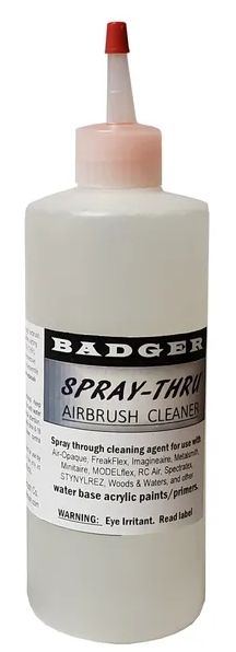 Spray-Thru Airbrush Cleaner is formulated to specifically break down and re-wet any conven-tionally formulated waterbase acrylic paint for the purpose of flushing it entirely from the airbrush. This new cleaner formulation, when frequently sprayed through the airbrush, prevents and/or elimi-nates the build up of dried acrylic paint within the airbrush - virtually eliminating any need to disassem-ble the airbrush each time it’s used to clean it.