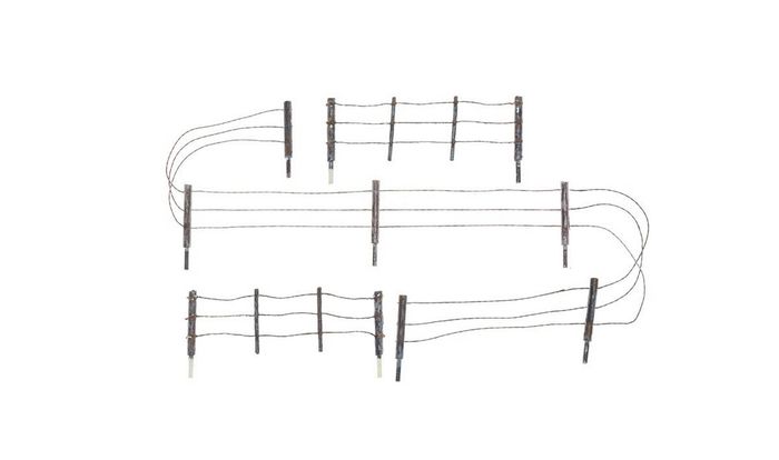 Line the edge of a pasture with handmade, pre-strung HO scale Barbed Wire Fence. Barbed Wire Fences come with loose corner post support pieces and feature a double-gate with detail hinges. Simply place the fencing around an area, and then set the planter pins, drill and glue.