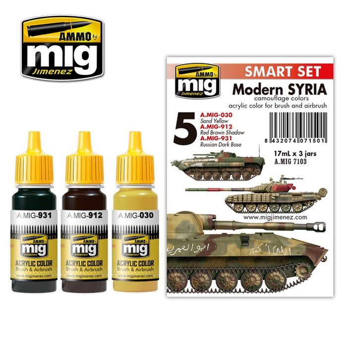 Acrylic paint set for the modern Syrian army vehicles, this set allows for accurate painting of the most common colors. Modelers will be able to paint these vehicles without complex mixtures and hours of research. All products are acrylic and are formulated for maximum performance both with brush or airbrush and the Scale Effect Reduction will allow us to apply the correct color on our models. Water soluble, odorless and non-toxic. Shake well before each use. Each jar includes a stainless steel agitator to facilitate mixture. We recommend A.MIG-2000 Acrylic Thinner for a correct thinning. Dries completely in 24 hours.