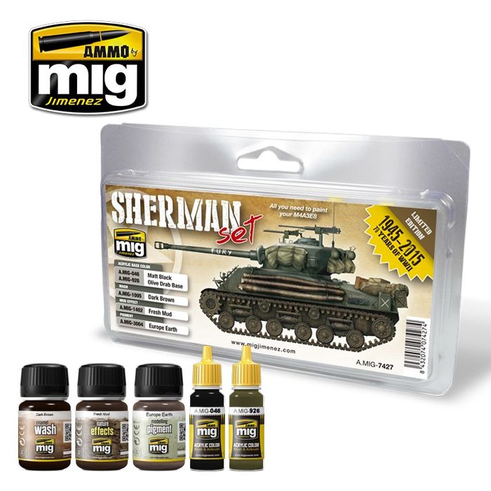 Set with essential and necessary products to paint late WWII Sherman tanks, FOR EXAMPLE any of those which appears in ‘FURY’ motion picture. The easiest and fastest solution for all modellers, from the experienced modeller who needs basic products for these vehicles to the newcomer that needs the neccesary ítems to begin to paint a Sherman. A basic compilation of some of the better AMMO products.