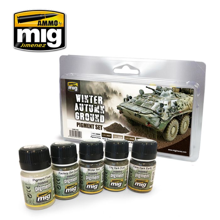 Cold and humid environments during winter and autumn tend to exhibit darker earth tones than terrain in warmer climates or seasons. This new set brings together a series of new dark shades of earth pigment tones. This set is ideal for representing the dark appearance of wet or fertile soil seen in many locations across Europe and Russia. These tones are also useful for agricultural and rural settings around the world. This set includes a complete range of realistic earth tones to help give more depth to your work and also includes pigment fixer.