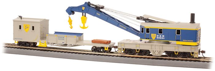 250-Ton Steam Crane & Boom Tender - DELAWARE & HUDSON - HO Scale. Railroad Crane and Booms are typically used for one three primary purposes; freight handling in goods yards, Railroad Maintenance, and accident recovery work. Bachmann Crain and Booms feature a Fully Assembled 250-ton steam crane & boom tender, Crane Swivels 360 Degrees, undercarriage detail, blackened metal wheels, body mounted couplers E-Z Mate® Mark II couplers, non-magnetic axles with Needle-point Bearings and Celcon Trucks.