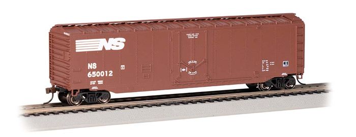 50' Plug-Door Box Car -NORFOLK SOUTHERN #650012 - HO Scale. The Plug Door Box Car has a door system that closes with a final inward movement that seals the door flush with the interior of the box car. The design seals the door much better that a traditional sliding door box car. Plug Door Box Cars were used by a wide variety of railroads and other commercial companies. Bachmann’s Plug Door Box Cars come in a variety of colors and road names. Each car is fully assembled and features; Highly Detailed Painted Bodies with Precision Graphics, Blackened Machined Metal Wheels with RP 25 Contours, Magnetically Operated E-Z Mate® Couplers, Non-magnetic Blackened Brass Axles with Needle-point Bearings, Celcon Trucks, and Added Weight for Optimum Tracking Performance