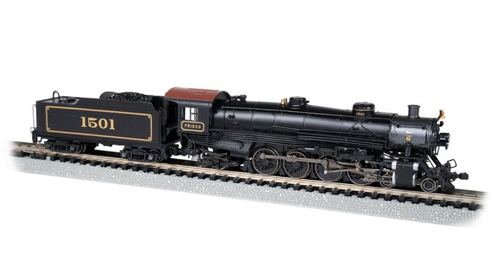 N Scale 4-8-2 Light Mountain - Frisco #1501. Bachmann is delighted to offer this N scale 4-8-2 Light Mountain equipped with an Econami™ SoundTraxx® steam package. Factory-set for 4-8-2 realism, the steam package offers a choice of 16 whistles, multiple variations of 6 bell types, 4 prototypical chuffs, 5 air pumps, and 4 dynamos plus cylinder cocks, grade crossing signal, blowdown, brake squeal/release, coupling/uncoupling, water stop, and "All aboard"/coach doors—all in 16-bit polyphonic sound.