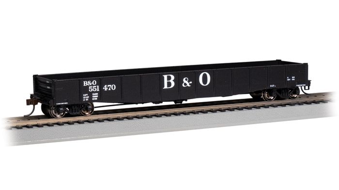 50'6" Drop End Gondola - Baltimore & Ohio® #551470. Designed for ease of loading and unloading, the Drop End Gondola could be found across North America from 1937 to as recently as the 1990s. Used for carrying coil loads, scrap metal, tires, and other bulk commodities, and in their later years, maintenance-of-way materials, these cars were popular among railroads for most of the 20th century. The Bachmann 50.6" Drop End Gondola features detailed construction and functioning drop-ends for loading and unloading.