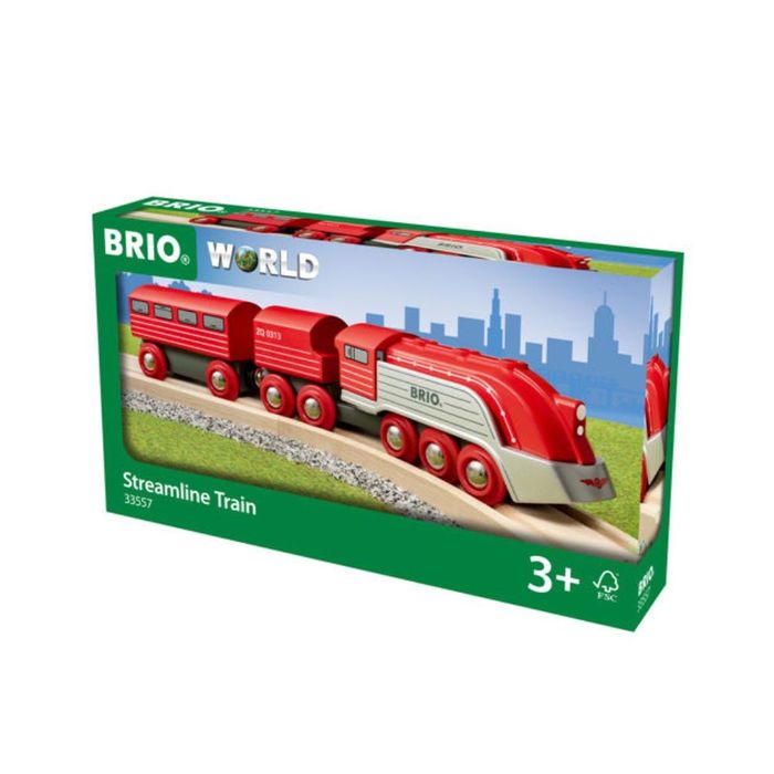 The 33557 Streamline Train is a stunning addition to any BRIO World railway. The train’s unique retro-futuristic design takes inspiration from streamline trains from around the world and is finished with bold red colours and shiny silver details. This extra-long train includes two wooden wagons with fine details and seven pairs of wheels to keep it rolling at high speed. Crafted using beech wood, high-quality plastic and metal details, this toy train is ready to ride the wooden tracks once again.