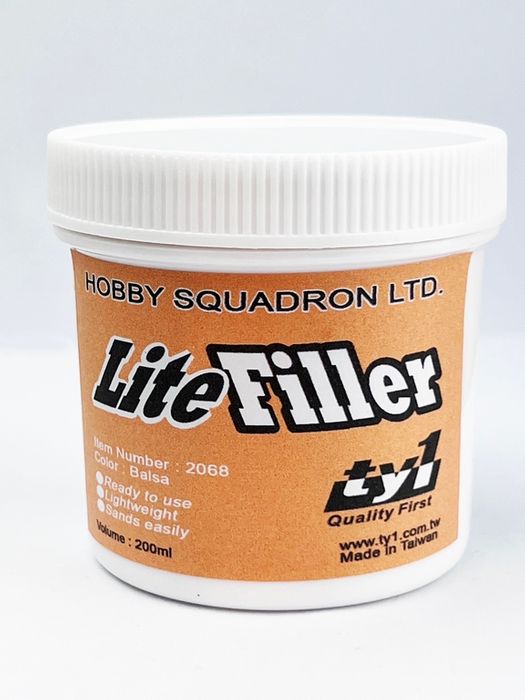 RBS2068 Lite Balsa Colour Filler, is in fact similar in colour to balsa wood. Fills cracks and pinholes. Extra light formulation adds insignificant weight to airframes. Ready to use, spreads easily, dries fast and sands to a smooth finish.. Paint or cover it. May be used on wood, foam, fibreglass and painted surfaces without shrinking.