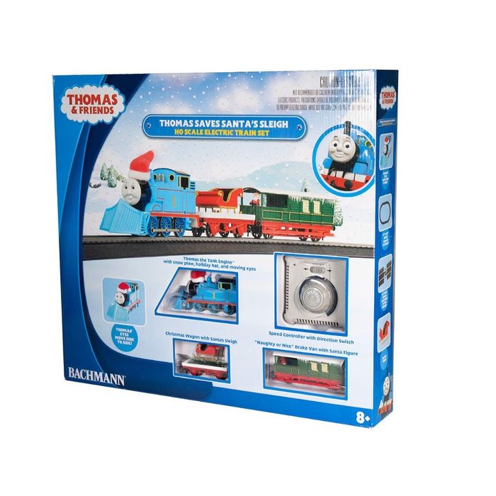 Thomas Saves Santa's Sleigh Train Set - HO Scale. Join Thomas on a magical adventure as he saves the day by bringing Santa Claus his trusty sleigh just in time for Christmas deliveries! Features Thomas with moving eyes, two festive freight cars including a Plank Wagon with Christmas Sleigh Load, “Naughty or Nice” Brake Van with Santa figure, and a full oval of snap-fit E-Z Track®.