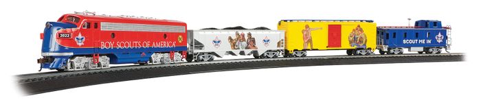 Celebrate the past and look to the future of the Boy Scouts of America® with the BSA® All American train set! Featuring an iconic F7-A diesel locomotive with operating headlight, two vibrantly painted freight cars featuring classic Joseph Csatari BSA® artwork, and a stylish blue caboose, this set is prepared to enter the mainline for a lifelong adventure in model railroading!